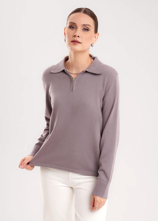 Вязаный джемпер из вискозной пряжи с добавлением нейлона свободного силуэта, переплетения гладь. Плечо переведено на спинку. По горловине отложной воротник. с застежкой на молнию. Длинный втачной рукав. По низу изделия и рукавов манжеты.