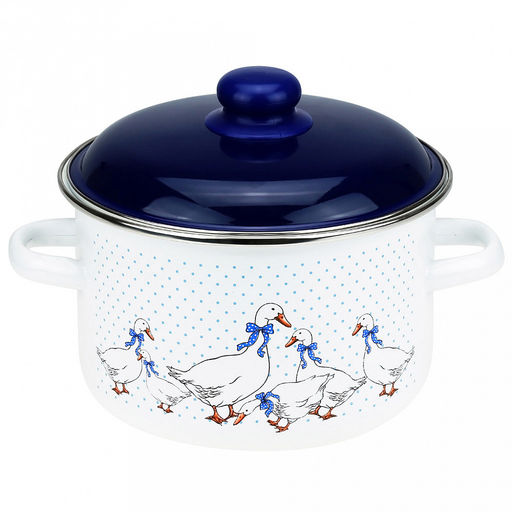 • "Гуси" Кастрюля эмалированная 4л, д22см, h13см, цилиндрическая форма, металлическая крышка, белый (Россия)