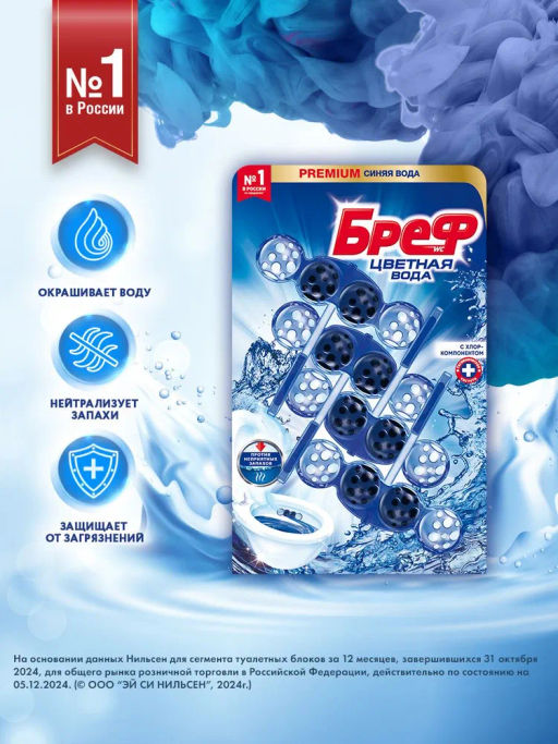 Бреф Цветная Вода подвесной туалетный блок с технологией нейтрализации запахов, которая создает защитный барьер на пути неприятных запахов.