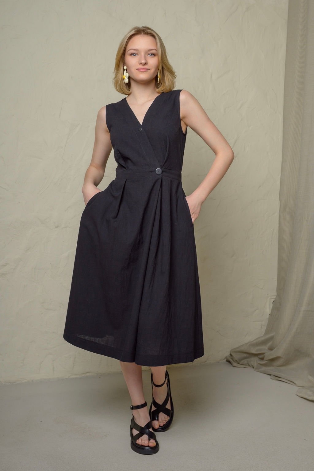 Визуально сарафан смотрится в стиле на запах, но конструкция не предусматривает распахивание низа изделия. Верхняя часть (лиф) имеет дополнительную застежку для фиксирования , за счет этого исключено распахивание при движении на уровне груди. Крупные складки смотрятся оригинально и конструктивно обеспечивают отличную посадку на фигурах с пышной грудью.