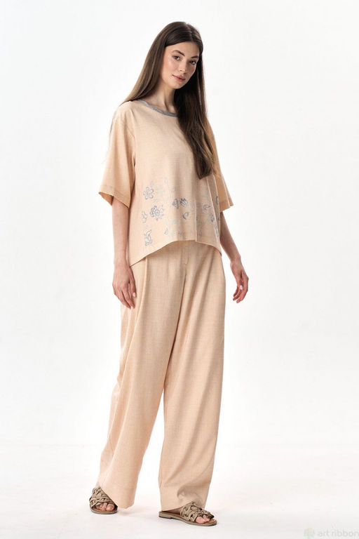 Брюки-палаццо свободного силуэта с карманами. Пояс притачной, застежка центральная на тесьму-молнию. Возможно отличие фотографии по оттенку, связанное с разной цветопередачей монитора.