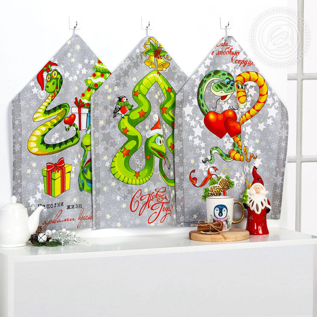 Маскарад новогодние полотенца из рогожки с ярким дизайном. Главные герои здесь веселые змейки, которые украшают дом к счастливому празднику. Они наряжают ёлку, готовят подарки и примеряют образ Деда Мороза. Уникальный рисунок дарит положительные эмоции и приближает ощущение торжества. Приятный сюрприз для родных и друзей. Рогожка Хлопок 100% Пакет ПВХ с вкладышем