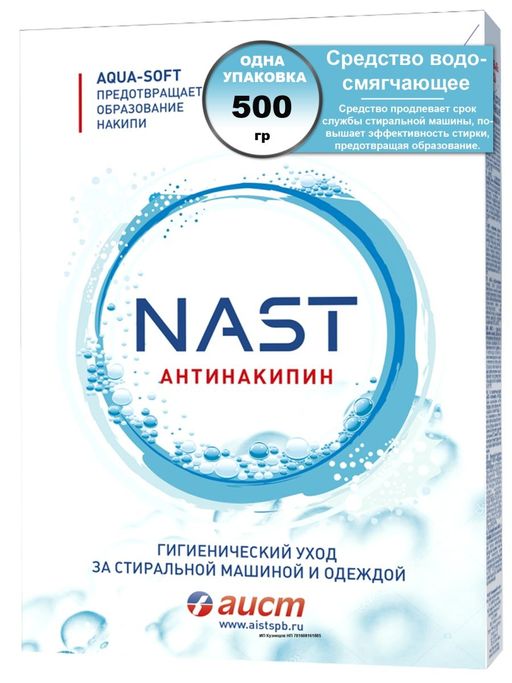 Внешний вид товара может отличаться от фотографий на сайте. Средство водосмягчающее "NAST"Антинакипин предназначено для предотвращения образования накипи на нагревательных элементах, металлических и пластмассовых частях стиральных машин и умягчения воды.