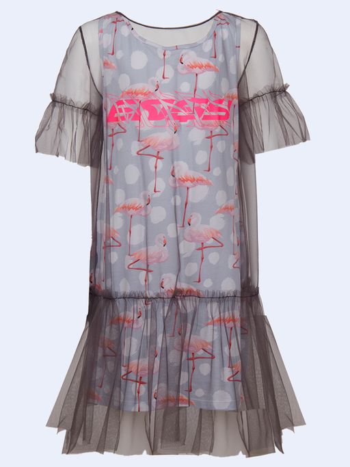 Платье для девочки двойное А-образного силуэта, средней длины.Нижнее платье из кулирки с лайкрой, без рукавов, с круглым вырезом горловины. Полочка декорирована принтом. Верхнее платье из сетки,с рукавом длиной до локтя. По низу рукавов и низу изделия пришита оборка. Состав:72% х/б, 20% п/э, 8% лайкра
