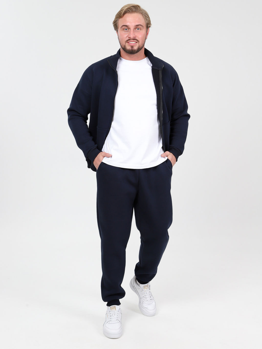 Утепленный мужской костюм из футера с начесом, с крашением варенка. Толстовка с высоким горлом на молнии, карманом кенгуру и манжетами из кашкорсе по низу рукавов и кофты. Брюки джоггеры с карманами в боковых швах, поясом на резинке с несколькими отстрочками и манжетами из кашкорсе по низу брюк.­