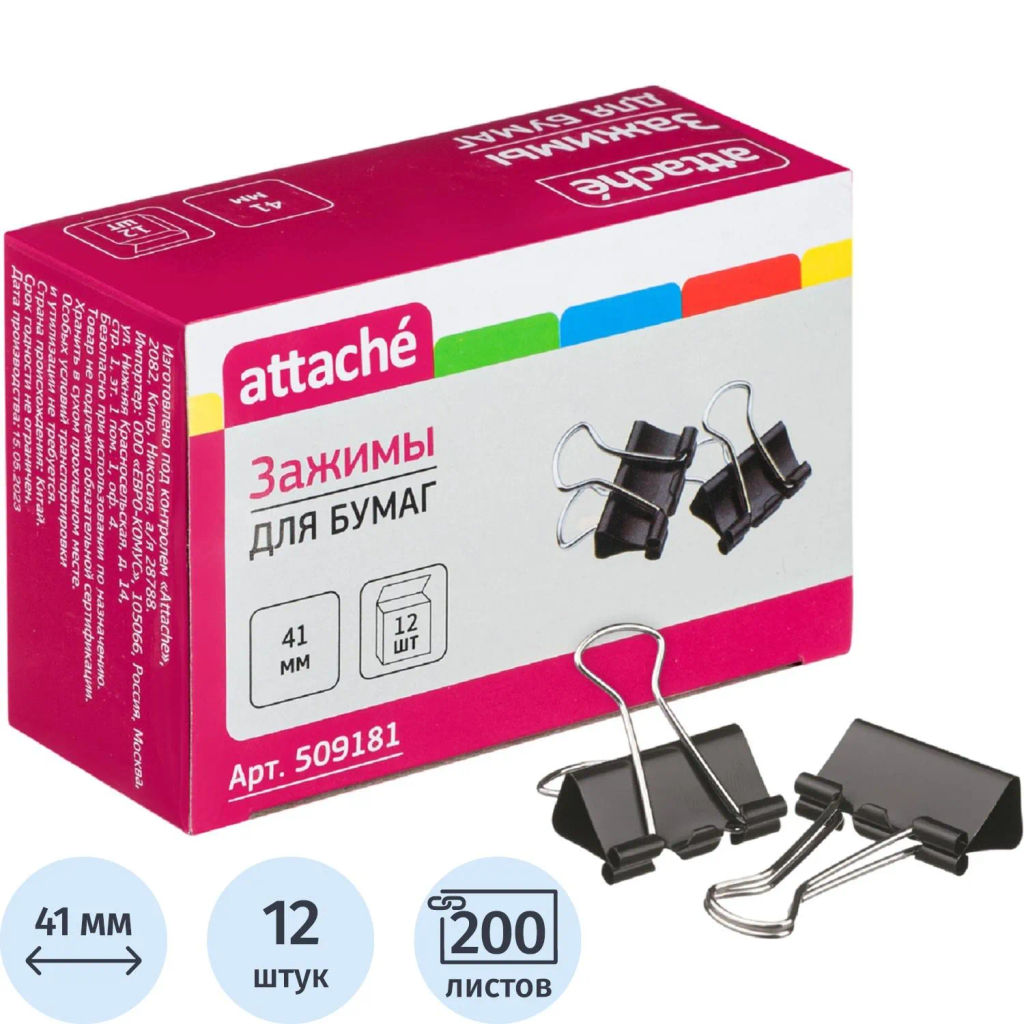 • Зажимы для бумаг 41мм 12шт/уп Attache, в картонной коробке