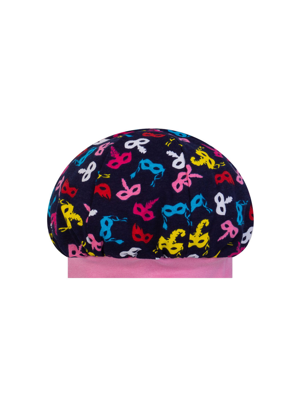Качественный детский берет обязательно станет любимым головным убором малыша. Изделие аккуратно выполнено из кулирки. По краю берета проходит эластичная трикотажная манжета розового цвета, благодаря которой изделие не сползает на глазки и не поднимается вверх, открывая ушки ребёнка. Сшито из трикотажа темно-синего цвета с принтом маски.