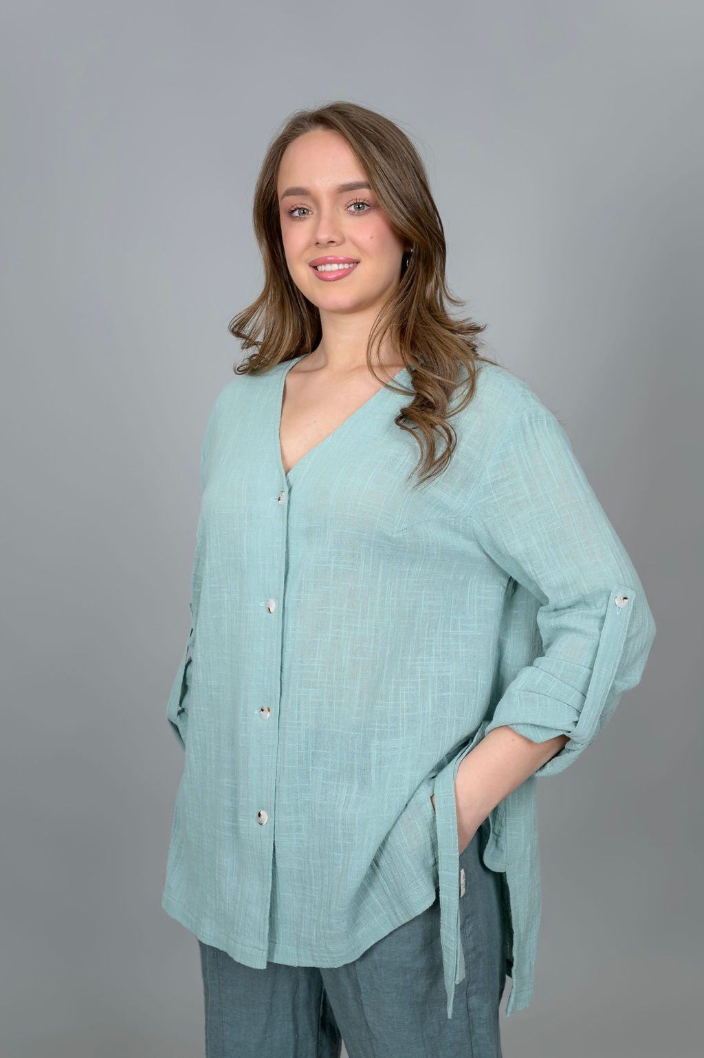 Блуза рубашечного покроя, с боковыми вставками в форме клиньев, рукавами 7/8 и удлиненной спинкой, прикрывающей ягодицы. Ширину в талии можно регулировать с помощью завязок.
