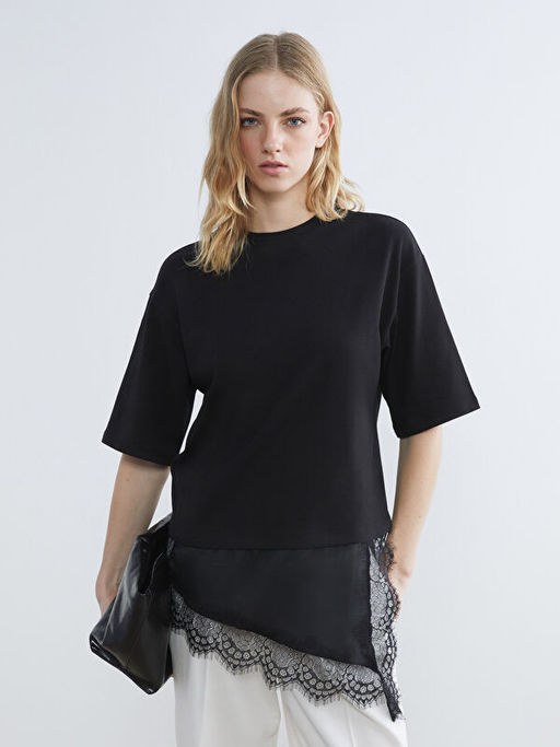 • Bisiklet Yaka Dantel Detayl? Kad?n Ti??rt