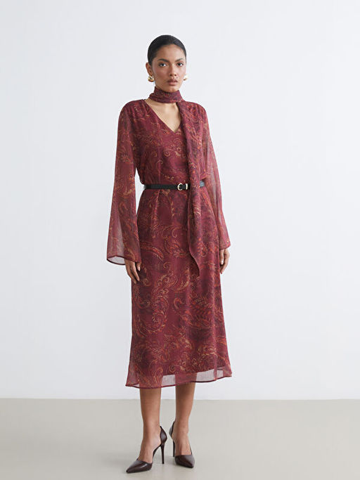 ?al Yaka Desenli ?spanyol Kollu Kemerli Elbise