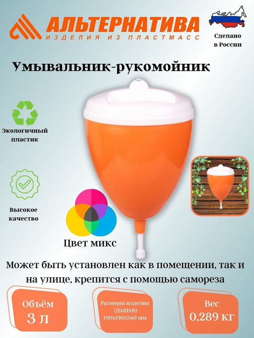 Умывальник - рукомойник изготовлен из полипропилена, не имеет токсичного запаха . Может быть установлен как в помещении, так и на улице, крепится с помощью самореза. На крышке имеется выемка для мыла и площадка для стакана. Изделие легко мыть и содержать в чистоте.­