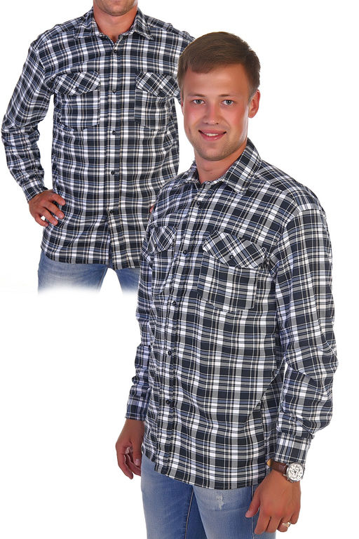Мужская рубашка в клетку с длинным рукавом. Ткань фуле - ворсовая 100% хлопок. Модель свободного кроя, дополнена двумя накладными карманами и клапанами с пуговицами. Планка на полочке цельнокроеная, застегивается на пуговицы. Плечо приспущено, рукав до запястья на манжете. Воротник на стойке, проложен флизелином с отстрочкой. Низ изделия застрачивается швом в подгибку при помощи специального приспособления. Внимание ! Данный товар по цвету не подбирается.