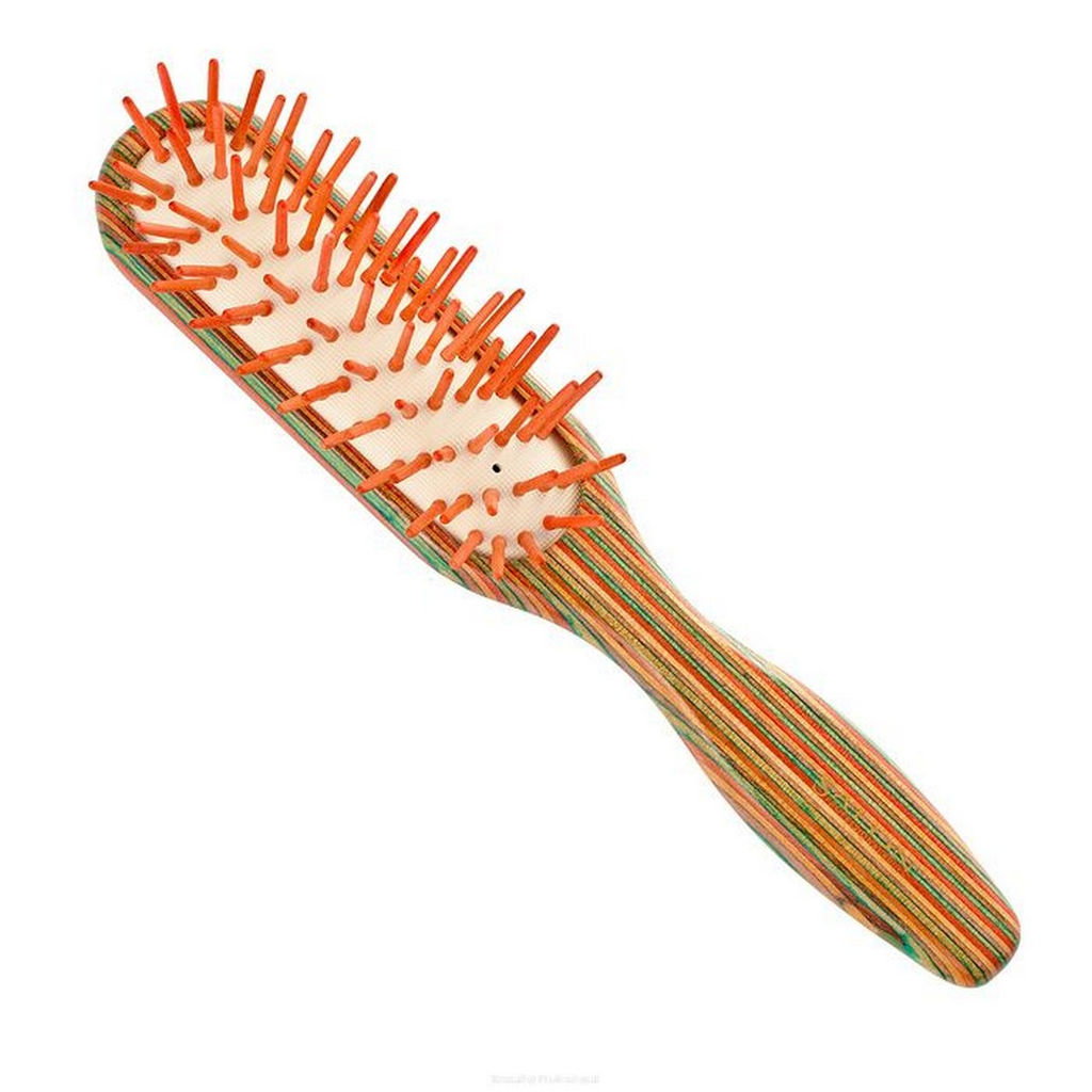 Деревянная массажная расческа для волос цветная с деревянными штифтами, L 210 мм. Уникальная серия расчесок, основание которой набраны из множеств разноцветных слоев дерева, а специальное расположение крупных деревянных зубцов позволяет с легкостью расчесывать даже сильно вьющиеся волосы.