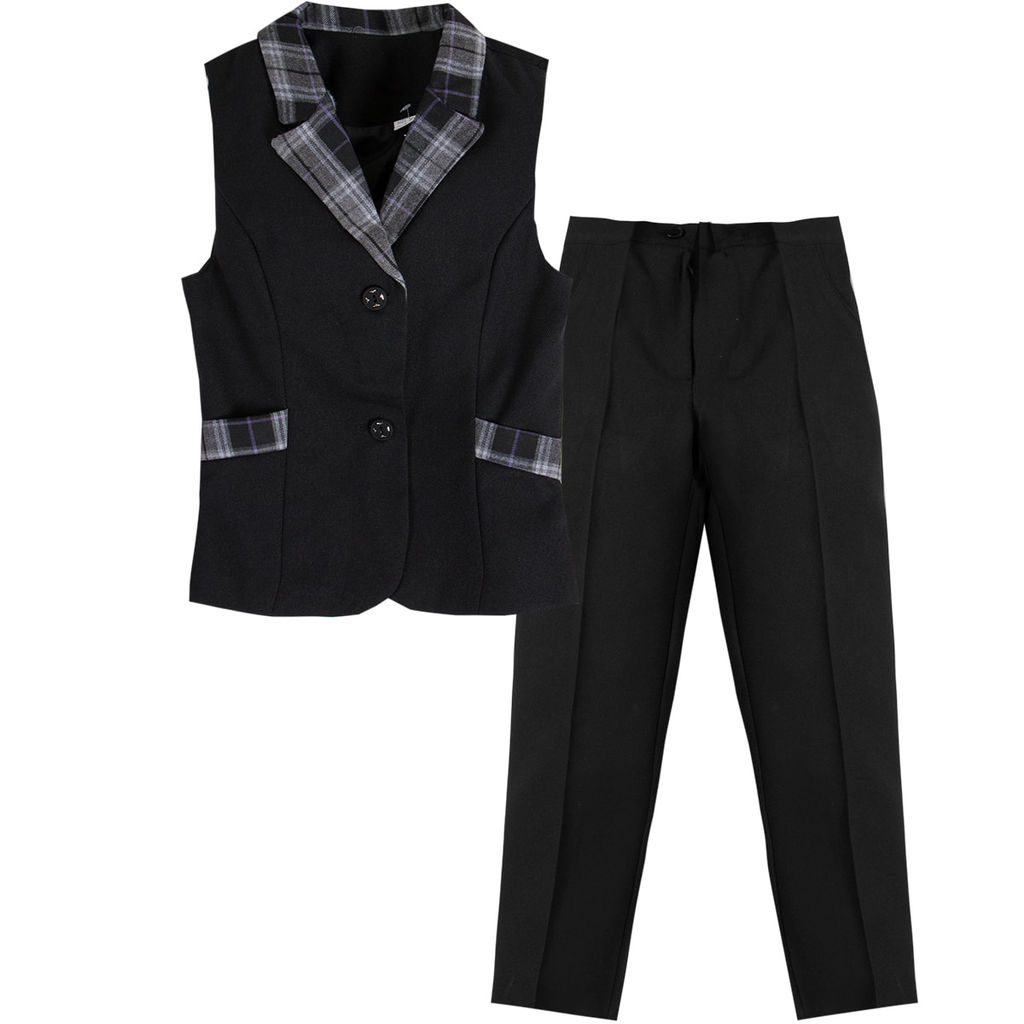 Жилет приталенный, на пуговицах, с красивой клетчатой отделкой по воротнику и имитации карманов.