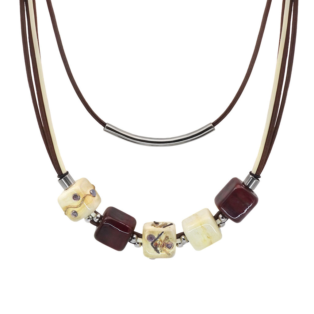 Колье изготовлено из натуральной кожи, муранского стекла и гипоаллергенной ювелирной стали, что очень важно для людей с чувствительной кожей. Металл не темнеет и не подвергается воздействиям окружающей среды, надолго обеспечивая красивый внешний вид изделия. Длина колье - 90 см + 5 см. удлиняющая цепочка. Размер стеклянных кубов - 1,3х2,1,3 см. Вес - 29 гр.­