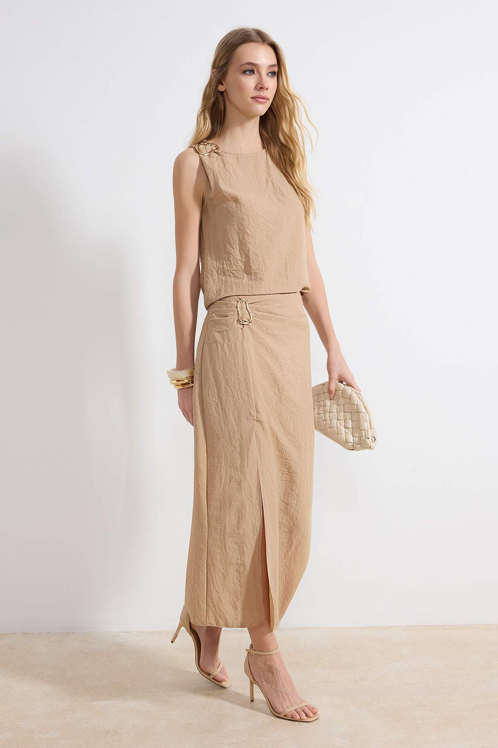 Bej Aksesuar ve Y?rtmac Detayl? Bluz-Etek Dokuma Alt - Ust Tak?m TWOSS26AU00034