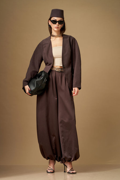 Брюки свободной формы, с низкой посадкой, сильно расширенные и собранные снизу на резинку. Верхний срез обработан поясом на резинке, центральная часть переда без резинки. Брюки по силуэту называются алладины.
