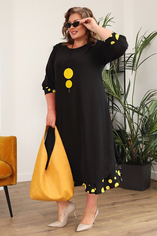 Элегантное платье мягкого материала  на подкладке. Модель имеет  круглый вырез и рукава длиной 3/4, оформленные контрастным кантом по низу. Свободная юбка верха с асимметричными краями искусно обыгрывает фигуру и подчеркивает женственность образа. Подол нижней юбки с гороховым принтом придает модели женственности и романтизма. Полуприлегающий силуэт искусно обыгрывает фигуру и визуально стройнит. Нарядности добавляет оригинальное ожерелье. Платье станет идеальным нарядом для любого повода. Стильный клатч и туфли на каблуках станут идеальным дополнением к нарядному образу.