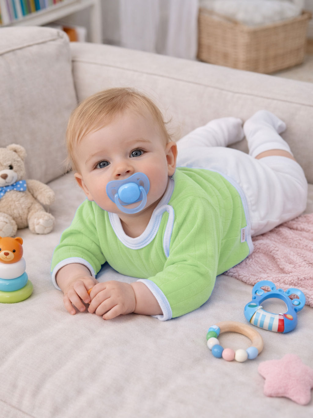 Особенности модели: Кофточка-распашонка однотонного цвета. Сшита швами наружу из плотного эластичного, дышащего трикотажа. Открытая ручка. Застежка спереди на одну клепку. Края обработаны трикотажной бейкой. Застёгивается на клёпку спереди. Подходит для частой носки, хорошо переносит стирку.