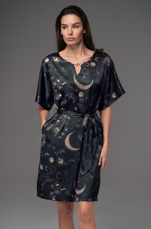 Туника Mia-Amore длиной до колен со спущенными цельнокроенными рукавами выполнена из смесового принтованного полотна. По центру вырез горловины украшен кружевным декоративным элементом. По талии туника приталивается с помощью пояса, в боковых швах есть карманы. Состав: 70% натуральный шёлк, 25% полиэстер, 5% эластан