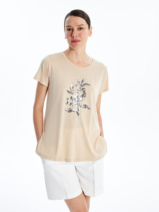 Bisiklet Yaka Bask?l? K?sa Kollu Kad?n Ti??rt