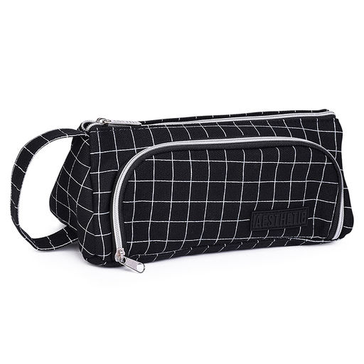 • Пенал "Aesthetic" 21x8,5x8,5 см, треугольный для 70 предметов, плотный канвас с рисунком, на молнии, с ручкой, наружный объемный карман на молнии с плавающей перегородкой, с каучуковой аппликацией, черный в клетку