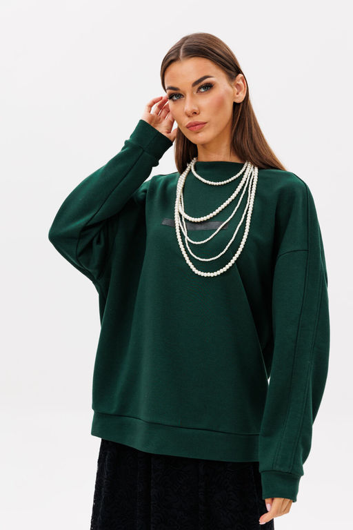 Свитшот прямого свободного силуэта oversize со спущенной линией плеча. Рукав трехшовный, оканчивается манжетой, шириной 5,5 см. По центру линии плеча рукава вставлены лампасы из основного трикотажного полотна шириной 4 см. Горловина имен округлый вырез, обработана планкой по косой, шириной 3 см. Низ изделия обработан планкой-манжетой, высотой 6,5 см. На фронтальной части переда расположен декоративный элемент: нашивка вытянутой прямоугольной формы. Длина изделия свитшота по центральной линии спинки 70-72 см, в зависимости от размерного ряда.