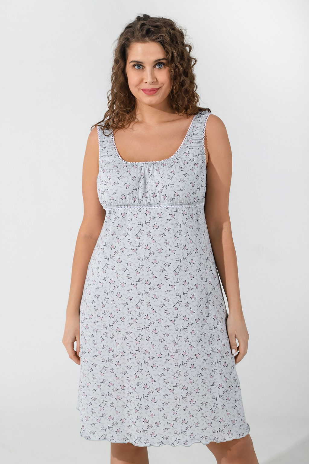 Сорочка женская из трикотажного полотна кулирка с набивным рисунком, расширенная книзу, без рукавов, с расширенной, углубленной горловиной овальной формы и притачной кокеткой по переду. Срезы пройм и горловины, а также шов притачивания кокетки, обработаны фасонной эластичной тесьмой с кружевным краем. Низ изделия обработан узкой обметочной строчкой.­