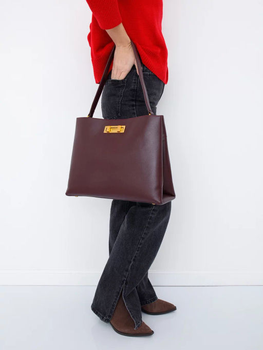 Стильная модель, выполнена из натуральной кожи. Дополнена золотистой фурнитурой.  Данная модель закрывается на вертушку. Носится в руке за встроенную ручку или на плече, в комплекте имеется съемный ремень с регулировкой длины. Каркас полужесткий. На дне предусмотрены ножки.
