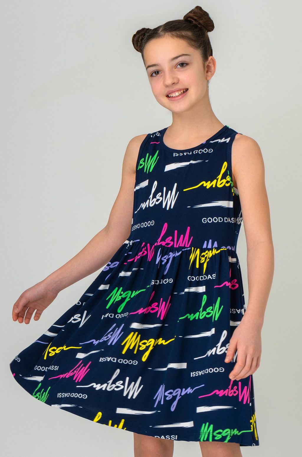 Яркое летнее платье с принтом надписи влюбляет в себя с первого взгляда. Легкое платье для девочки и девочки-подростка выполнено из хлопкового трикотажа, идеального для жарких дней.