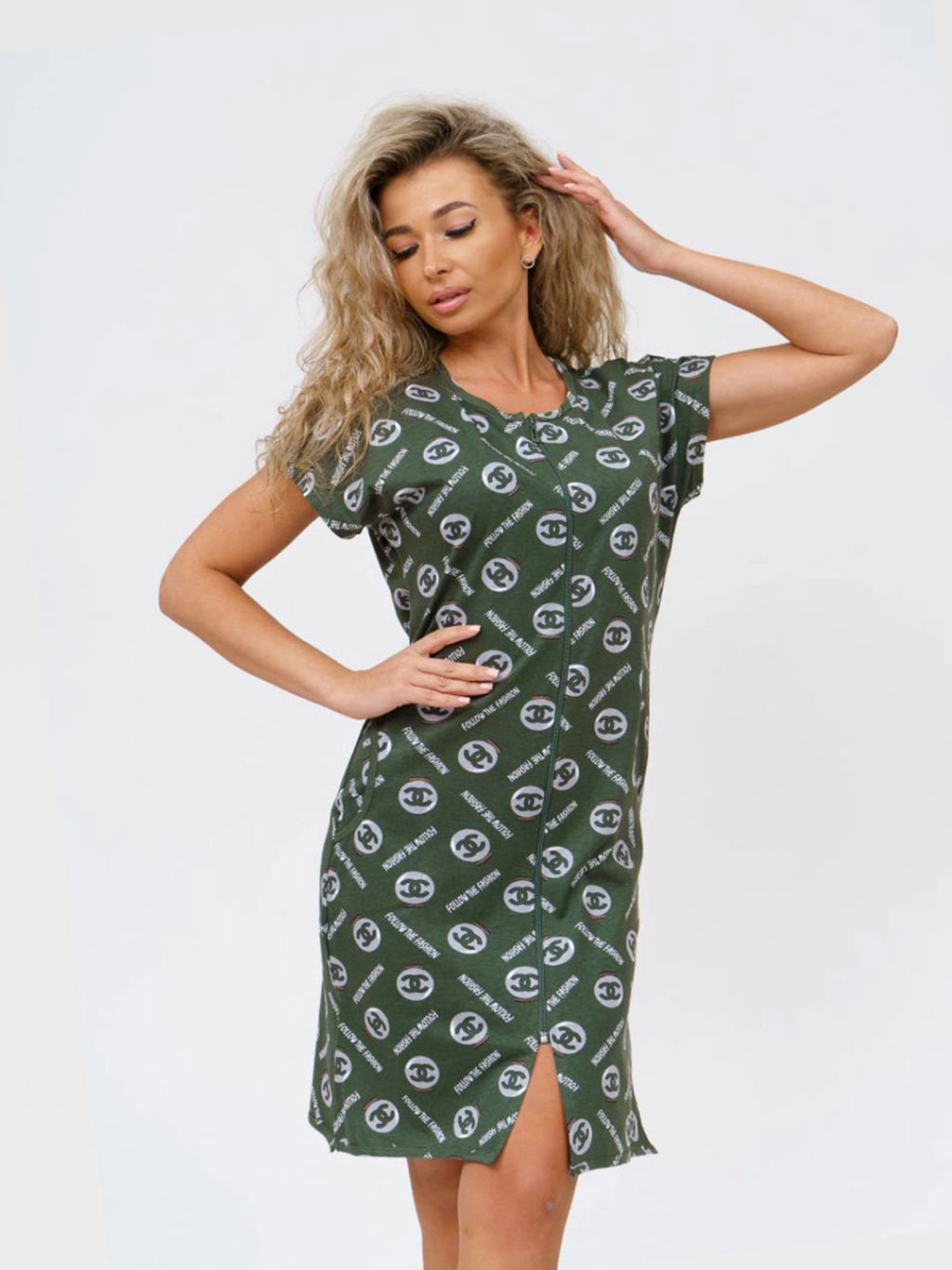 Женский домашний халат из 100% хлопока, длиной до колена, с карманами в боковых швах и коротким рукавом.­