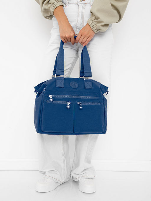 Сумка выполнена из текстиля.  Дополнена серебристой фурнитурой. Данная модель закрывается на молнию. Носится на плече или в руке за встроенные ручки. В комплекте имеется съемный ремень с регулировкой длины. Каркас мягкий.