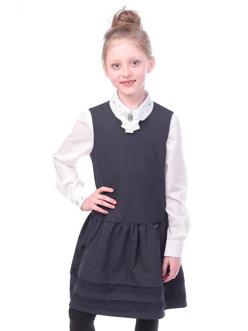 Сарафан для девочки из текстильного полотна, полуприлегающего силуэта с вытачками по переду и спинке. По низу(юбки) сарафана две горизонтальные складки с притачным кружевом Состав:32% вискоза, 63% полиэстер, 5% лайкра