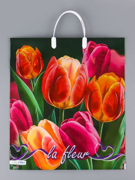 * Контрастный дизайн с цветочной темой: Яркие тюльпаны на чёрном фоне выглядят графично и смело, в отличие от традиционных пастельных решений. Такой пакет подходит для подарка женщине или девушке с современным вкусом, ценящей небанальные сочетания.