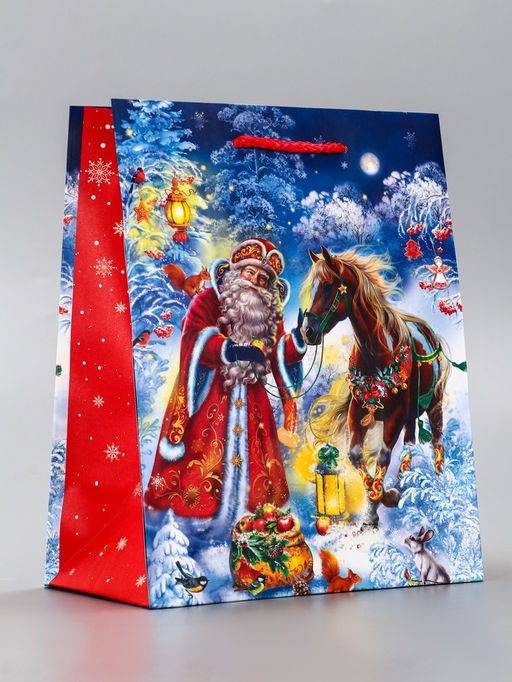 • Цена за 2 шт. Пакет подарочный новогодний ламинированный, «Дед Мороз с Конём», 18×10×22.3 см