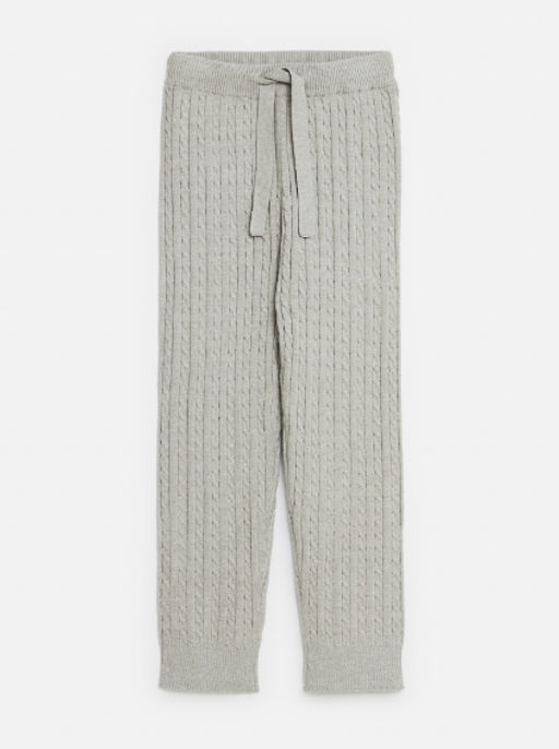 Комфортные брюки с вязаным рисунком в виде кос для девочек. Выполнены из мягкого и износоустойчивого материала с вискозой в составе. Полуприлегающий крой. Эластичный пояс на кулиске с утягивающим шнурком. Прекрасно подойдут для прогулок и уютных домашних посиделок.­