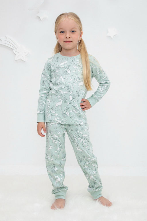 Трикотажный пижамный комплект из натурального хлопка. У джемпера длинные втачные рукава с мягкими манжетами. Брюки с удобным поясом на резинке и эластичными манжетами. Оригинальная набивка выполнена из стойких, гипоаллергенных текстильных красителей. Все трикотажные полотна производятся в соответствии с нормами Швейцарского сертификата ЭкоТекс.­