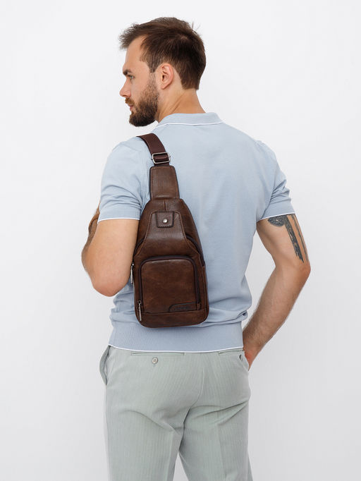 Рюкзак на одно плечо, выполнен из экокожи. Дополнен серебристой темной фурнитурой. Данная модель закрывается на кнопку и молнию. Каркас полужесткий. Носится на плече. В комплекте имеется встроенный ремень, который перестегивается на одну или другую сторону.