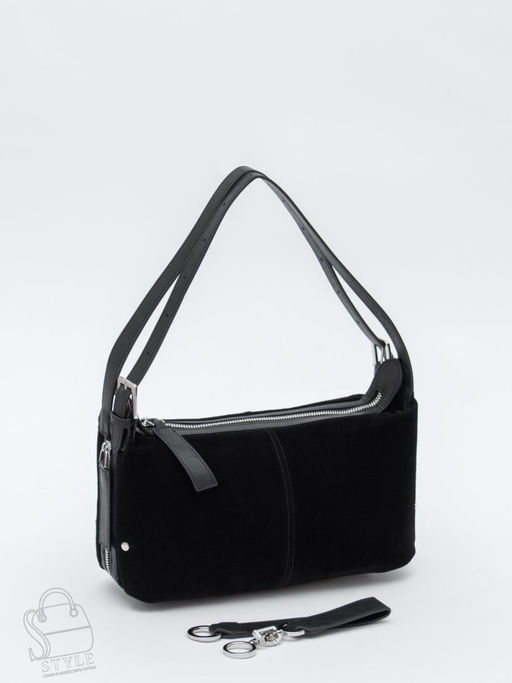 Базовая сумка, выполнена из замши. Декорирована брелоком на "собачке". Дополнена серебристой фурнитурой. Данная модель закрывается на молнию. Каркас мягкий. Носится в руке за встроенные ручки с регулировкой длины, или на плече. В комплекте имеется удлиняющий элемент.