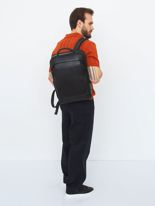 Мужской рюкзак выполнен из натуральной кожи. Дополнен темной фурнитурой. Данная модель закрывается на молнию. Каркас полужесткий. Носится в руке за петельку или на спине. Встроенные ремни регулируются по длине.