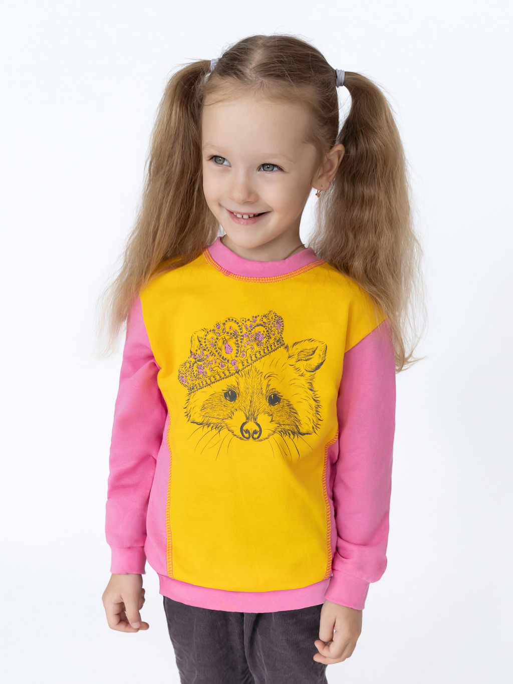 Детский джемпер с эластичной горловиной из мягкого хлопкового футера розового цвета. Интересный дизайн: контрастная желтая вставка с принтом енот спереди. По низу джемпера и рукавов эластичные мягкие манжеты. Подходит для ежедневной носки дома, в детском саду и на улице.