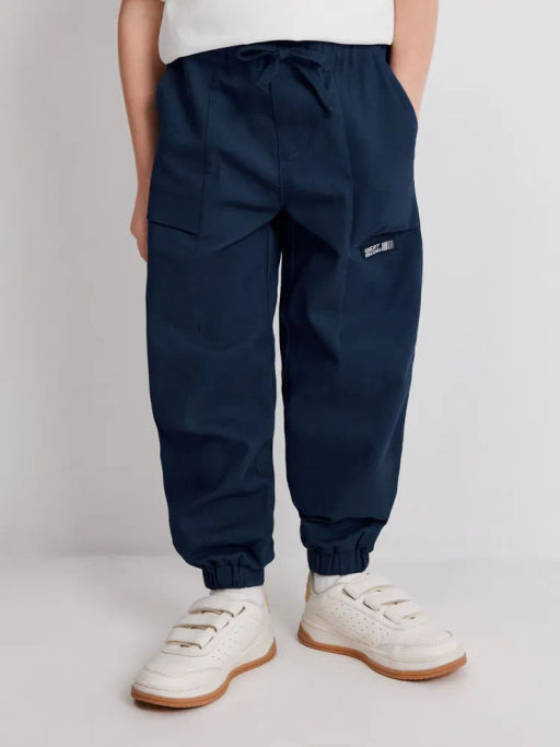 Детские брюки-джоггеры для мальчиков изготовлены из мягкой хлопковой ткани, которая отлично подходит для повседневного ношения. Эластичный пояс на резинке обеспечивает комфортную посадку на разные типы фигуры, а шнурок позволяет дополнительно отрегулировать полноту. Имитация гульфика придает изделию завершенный вид. Практичности модели добавляют два боковых кармана, уходящих в вытачку, а также один дополнительный накладной карман сзади. На левой штанине расположен декоративный патч с надписью "GREAT RACING" англ. - "Большая гонка", который придает стильный акцент. Низ брючин с манжетами на резинке, которые обеспечивают плотное прилегание и сохранение объемной формы. Темно-синие брюки-джоггеры будет легко стилизоваться в повседневных и спортивных образах. 20120160439
