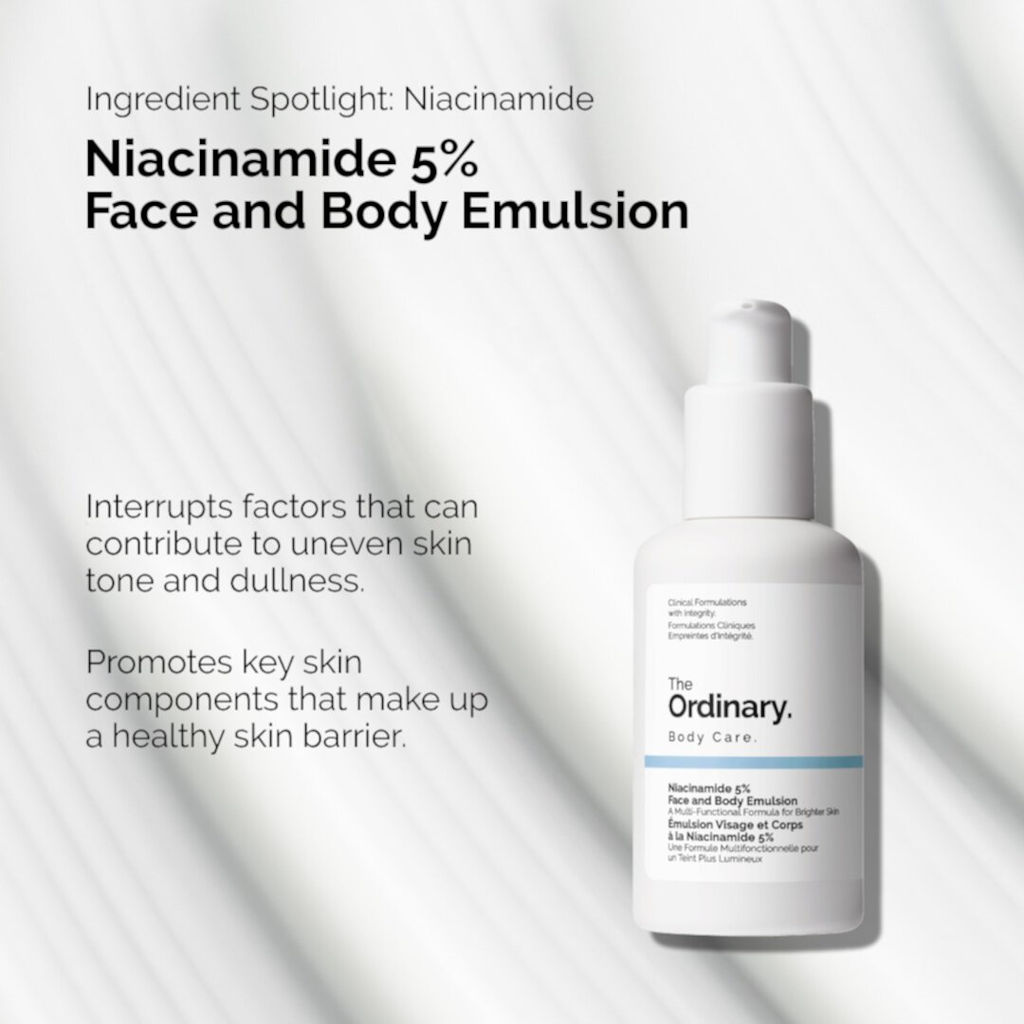 Доставка 4 недели! Niacinamide 5% Face & Body Emulsion— это многофункциональная формула, которая помогает устранить пигментные пятна на лице и теле, для более ровного тона кожи. Протестировано на всех тонах кожи, нацелено на появление пигментации на лице, шее, груди и руках — ключевых областях, склонных к неровному тону кожи — для более равномерного тона на лице и теле. Он включает 5% концентрацию ниацинамида для чувствительной кожи и обеспечивает мягкое осветление кожи. Кроме того, сывороточная формула также помогает улучшить ощущение текстуры кожи на лице, груди и ногах, одновременно увлажняя и укрепляя кожный барьер и способствуя более гладкой коже. Тестирование показывает — Помогает устранить видимые темные пятна на лице и теле за 3 недели — Заметно выравнивает тон кожи на лице и теле за 3 недели — Кожа начинает ощущаться более гладкой через 1 неделю — Мгновенно увлажняет — Укрепляет кожный барьер за одно применение Применение: наносить утром и вечером. Не использовать с Витамином С.