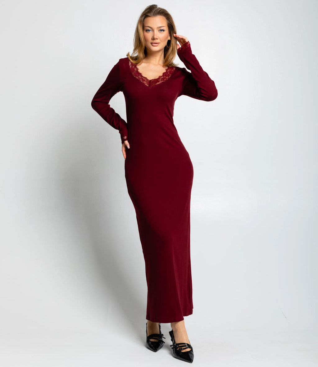 Платье это незаменимый элемент гардероба, который подчеркивает женственность каждой девушки. Платье длинное, облегающего силуэта, плавно расширяющееся к низу, с длинными рукавами. Выполнено из мягкой, эластичной ткани, подчёркивающей фигуру. Вырез V-образный, украшен кружевной вставкой, создающей нежный акцент в зоне декольте. Аналогичные кружевные детали присутствуют на манжетах рукавов, добавляя изысканности. Для пошива использовали 65% хлопок и 35% полиэстер, что обеспечивает не только комфорт, но и отличный внешний вид. Обратите внимание на насыщенные цвета и текстуру материала, которые отлично переданы на фотографиях на сайте. Для уверенности в выборе размера мы представили на странице таблицу измерений. Воспользовавшись ею, ваши клиентки смогут легко подобрать нужный размер. Предложенная цена на это платье является доступной для оптовых покупателей, что делает его отличным дополнением к вашему ассортименту. Не упустите возможность предложить своим клиентам стильное и комфортное платье, которое подчеркнет их индивидуальность и сделает их неотразимыми! -- Характеристики -- Цвет: бордовый Пол: Женский Страна производитель: Китай Сезон: Демисезон Материал: Хлопок, Полиэстер