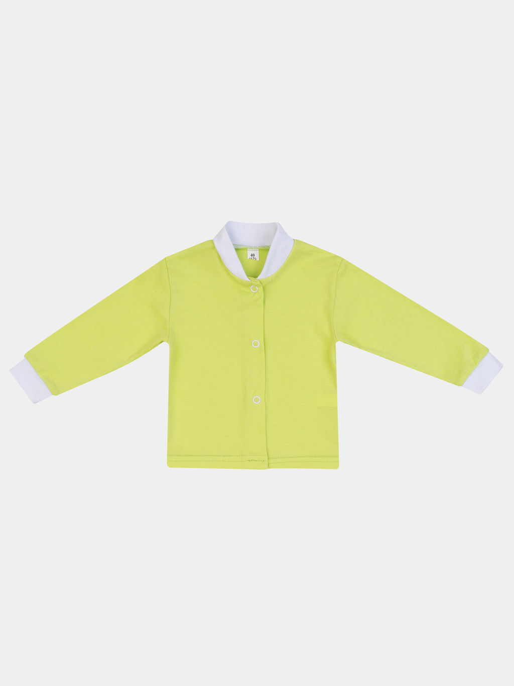 Трикотажная ясельная кофточка для повседневной носки новорожденному малышу. Изделие сшито из натуральной кулирки – гладкой, “дышащей” и нежной ткани салатового цвета. Кофточку удобно надевать/снимать с ребёнка – спереди есть прочные клёпки-застёжки.