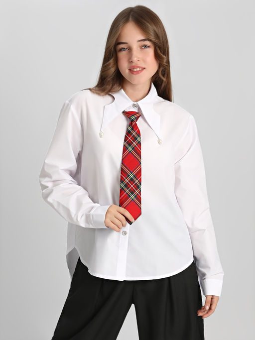 Блузка для девочки Соль&Перец, на пуговицах, из натурального хлопка. Блузка свободного кроя, с удлинённой спинкой. Отложной, фигурный воротник декорирован бусиной со стразами. Пуговицы украшены золотистыми вставками. Классический элемент школьной формы прекрасно дополнит гардероб каждой девочки.