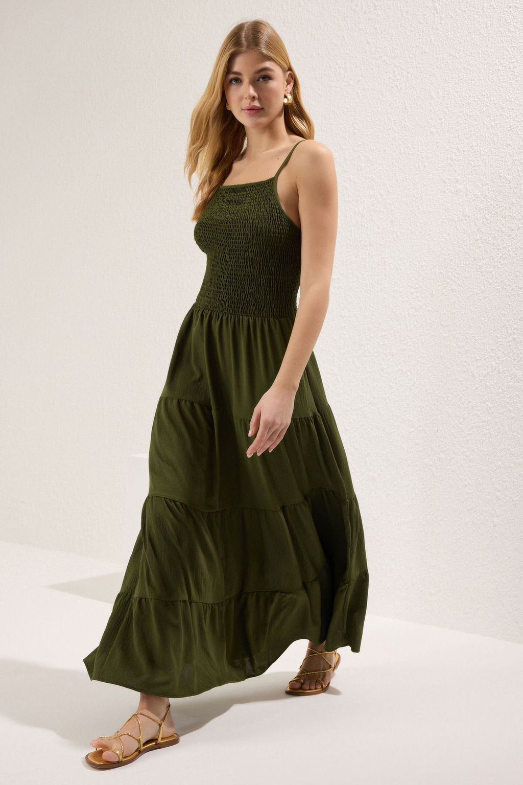 Haki Duz Etegi Belden Ac?lan Gipeli Maxi Dokuma Elbise TWOSS25EL00586