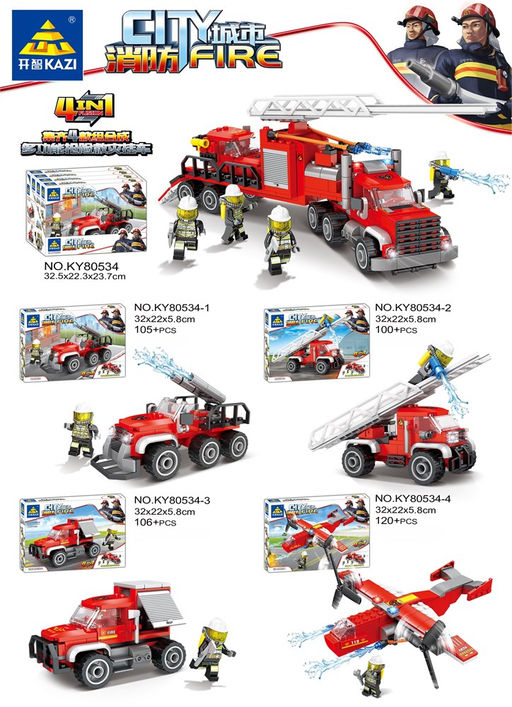 Конструктор "KAZI" 431 дет. "набор - 4 констр. "Пожар. техника" собираются в бол. пожар. машину" (KY80534)