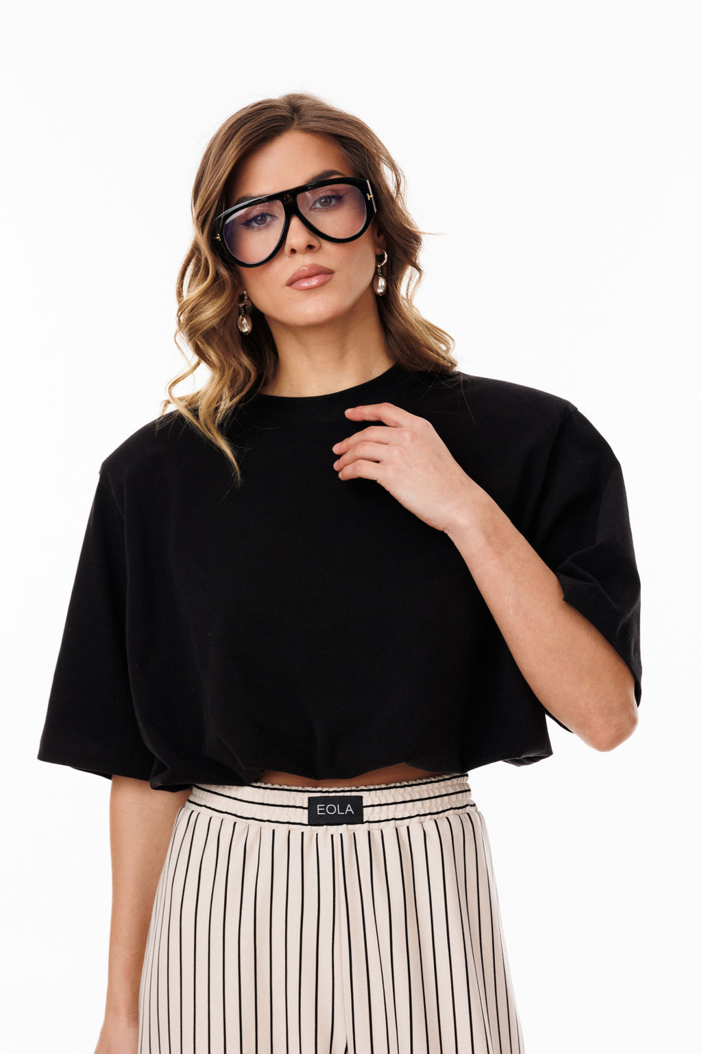 Джемпер выполнен из гладкорашенного трикотажного полотна. Джемпер О-образного силуэта, длиной до линии талии. Перед и спинка цельные. Горловина округлой формы, обработана бейкой. Плечевой шов удлинен. Рукав рубашечного покроя, одношовный, длиной до линии локтя. Джемпер на подкладке из основной ткани в виде нижнего топа на бретелях. Джемпер присборен по низу на эластичную тесьму по линии притачивания к нижнему топу. Джемпер с плечевыми накладками.