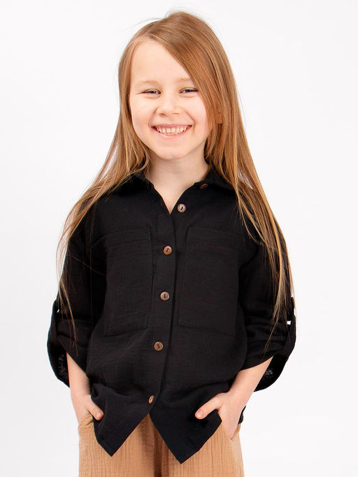 Стильная, детская, подростковая рубашка Соль&Перец свободного кроя. Рукава можно зафиксировать с помощью паты и пуговицы из кокоса. Модель рубашки с накладными карманами. Ткань-двухслойный муслин, хорошо пропускает воздух, защищает от солнца, идеально подходит для чувствительной кожи.